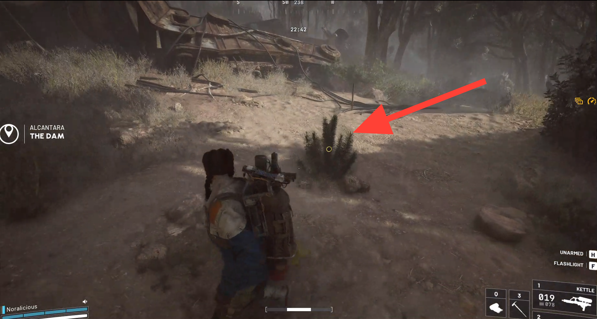Après avoir recherché le casque dans la brousse, ramassez-le manuellement tel qu'il sera sur le sol, puis dirigez-vous sur une courte distance vers le sud jusqu'au poteau commémoratif marqué d'une icône de casque holographique bleu brillant et interagissez avec lui pour placer le casque et compléter l'objectif.