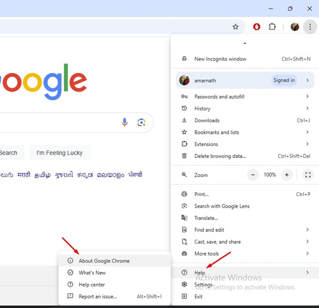 2. SélectionnerAide> sur Google Chrome.