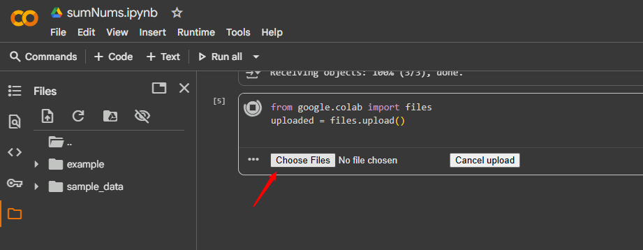uploaded = files.upload()Lorsque vous exécutez ce bloc-notes, il vous invite à télécharger un fichier. Cliquez sur leChoisir un fichierbouton pour sélectionner et télécharger n’importe quel fichier dont vous avez besoin.