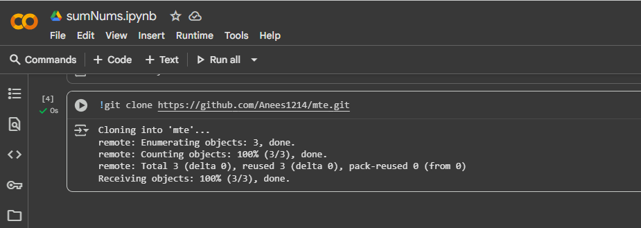 Vous pouvez directement cloner les référentiels GitHub dans votre environnement Colab. Cela vous aide à intégrer des projets existants, à les tester et même à apporter des modifications sans avoir à télécharger et télécharger manuellement des fichiers. Par exemple, si vous souhaitez utiliser un projet existant depuis GitHub, vous pouvez le cloner en exécutant la commande suivante dans une cellule Colab :