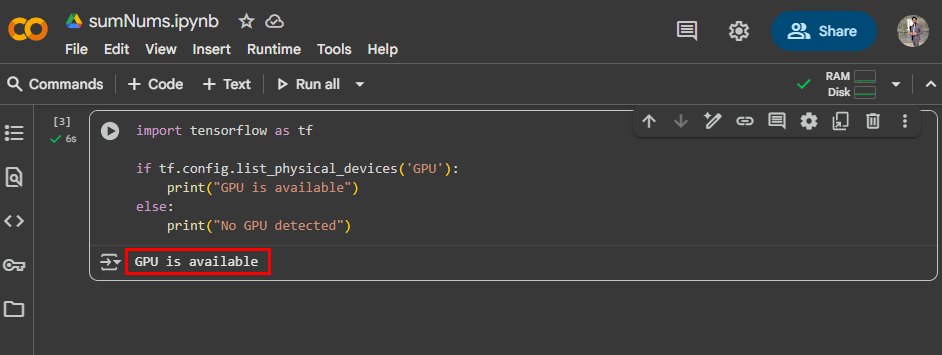 print("No GPU detected")Si un GPU est actif, il confirmera la disponibilité ; sinon, vous verrez un message indiquant qu'aucun GPU n'est trouvé.