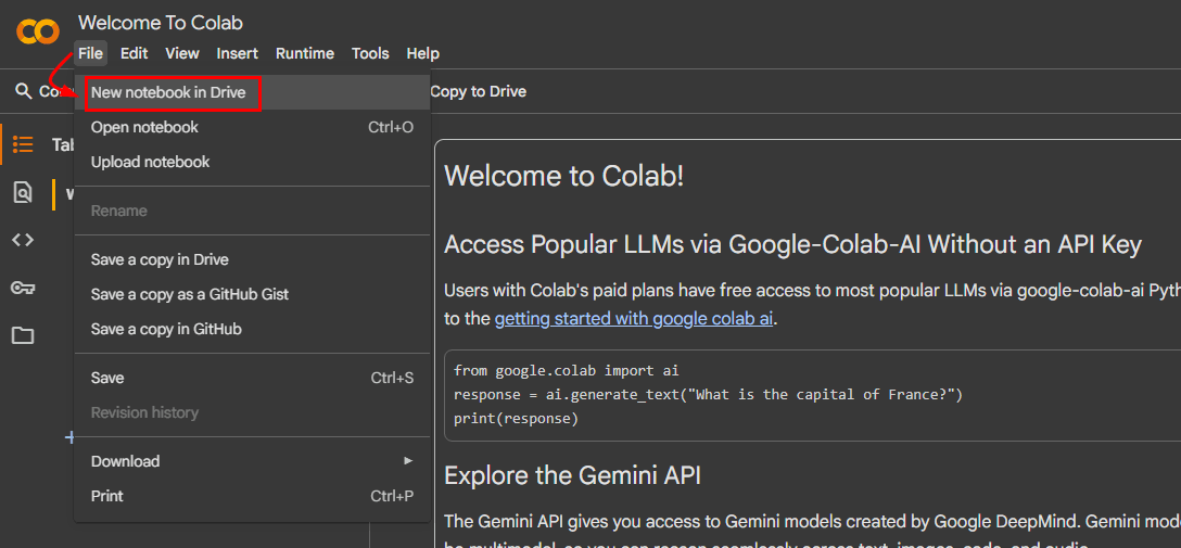 De plus, Colab vous offre la possibilité de télécharger vos blocs-notes dans différents formats. Par exemple, vous pouvez les enregistrer sous forme de fichiers « .ipynb » pour les ouvrir ultérieurement dans Jupyter Notebook, ou les exporter sous forme de fichiers « .py » si vous souhaitez exécuter le code directement dans un environnement Python en dehors de Colab. Pour ce faire, accédez àDéposer, survolez leTéléchargerpossibilité, etsélectionnez le format de téléchargementde votre choix :