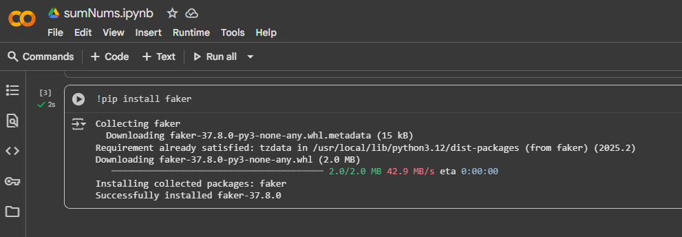 Une autre fonctionnalité pratique de Colab est que vous pouvez installer des packages Python avec pip, comme vous le feriez sur votre ordinateur local. Cela facilite l’intégration de n’importe quelle bibliothèque dont vous avez besoin. Par exemple, si vous souhaitez utiliser Faker, exécutez simplement :