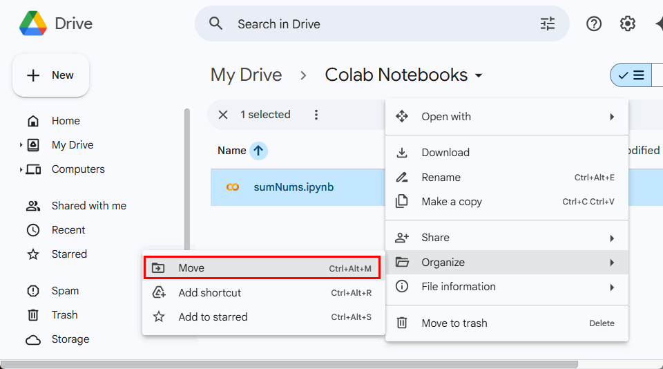 Dans Google Colab, organiser votre travail est simple puisque tous les blocs-notes sont stockés dans votre Google Drive. Vous pouvez déplacer un bloc-notes vers n'importe quel dossier de Drive, tout comme les fichiers ordinaires. Il est ainsi plus facile de séparer les projets et de tout garder en ordre.
