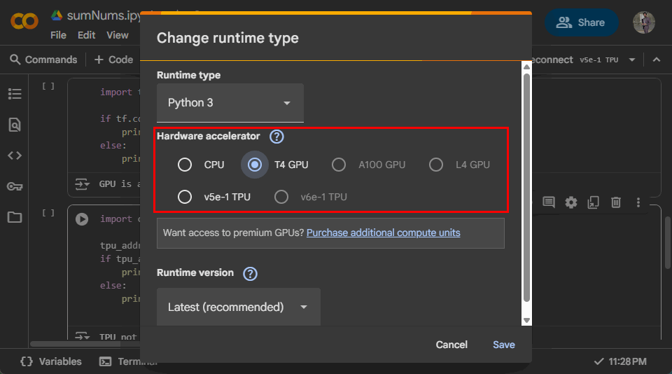 L'un des plus grands avantages de Google Colab est qu'il offre un accès gratuit à du matériel puissant comme les GPU (Graphics Processing Units) et les TPU (Tensor Processing Units). Ces accélérateurs réduisent le temps nécessaire à la formation des modèles d'apprentissage automatique par rapport à leur exécution uniquement sur un processeur.