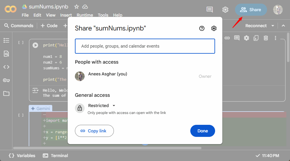 Tout comme le partage d'un fichier dans Google Drive, Google Colab vous permet de partager votre bloc-notes en saisissantadresses e-mailou pargénérer un lien partageableque d'autres peuvent utiliser pour afficher ou modifier, en fonction des autorisations que vous choisissez.