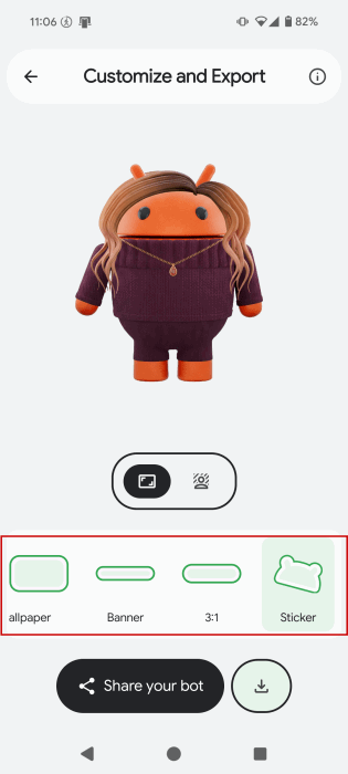 Google vous permet d'afficher le bot dans divers formats, comme une bannière ou un fond d'écran afin que vous puissiez l'utiliser comme arrière-plan pour votre écran d'accueil Android. Alternativement, vous pouvez choisir de le transformer en autocollant.