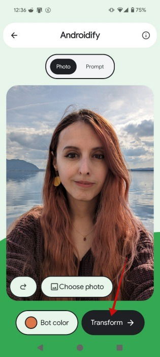 Enfin, appuyez surTransformerEt attendez quelques secondes jusqu'à ce que l'application génère votre création. Androidify utilise Gemini 2.5 Flash pour légendre la photo et l'imagen pour générer votre bot Android personnalisé.