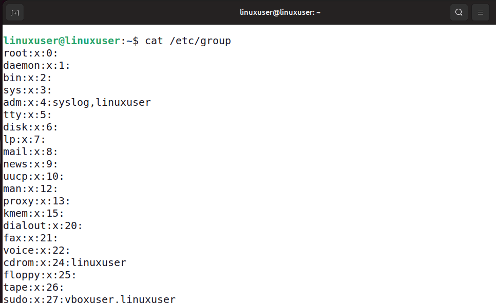 Cependant, cette méthode n'est pas recommandée car le fichier peut être assez important, ce qui rend difficile la recherche manuellement. Il est préférable d'utiliser la commande grep pour rechercher des modèles de texte dans le fichier «/ etc / groupe» à la place. Par exemple, la commande suivante vérifie les groupes d'utilisateurs pour Linuxuser dans le fichier «/ etc / groupe».
