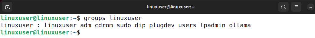 groups linuxuserVous pouvez voir que l'utilisateur est dans le groupe principallinuxuseret plusieurs groupes secondaires.