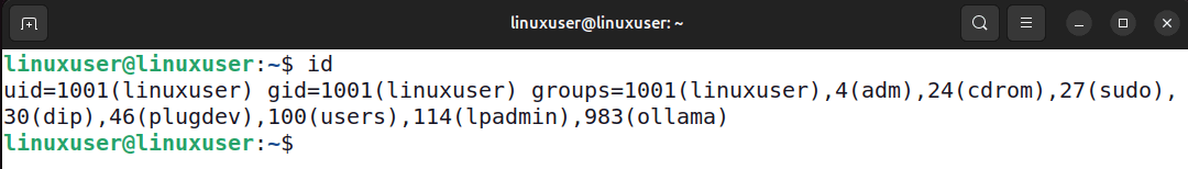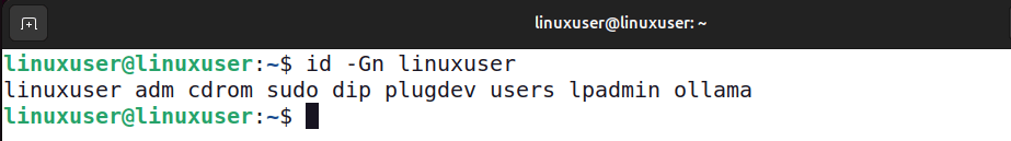 id -Gn linuxuserCette fois, leidCommande imprime les noms des groupes au lieu des ID numériques.