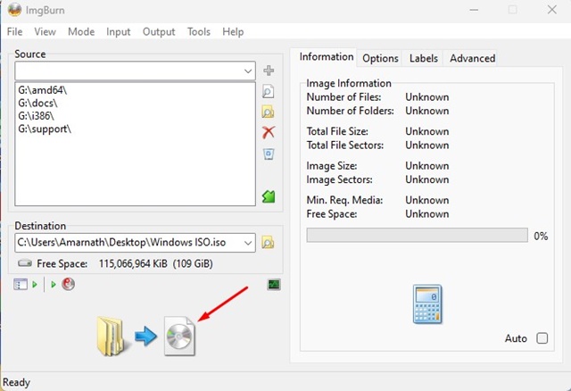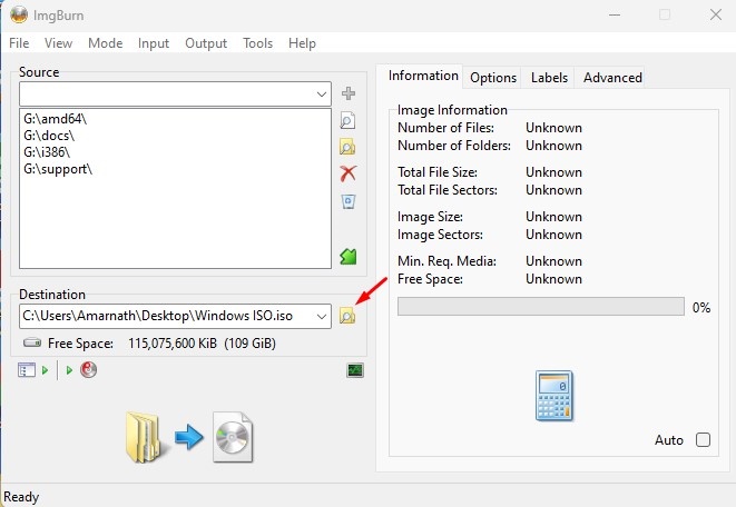 7. Cliquez sur leDossierbouton dans la section Fichier image de destination. Sélectionnez l'emplacement où vous souhaitez enregistrer le fichier image ISO.