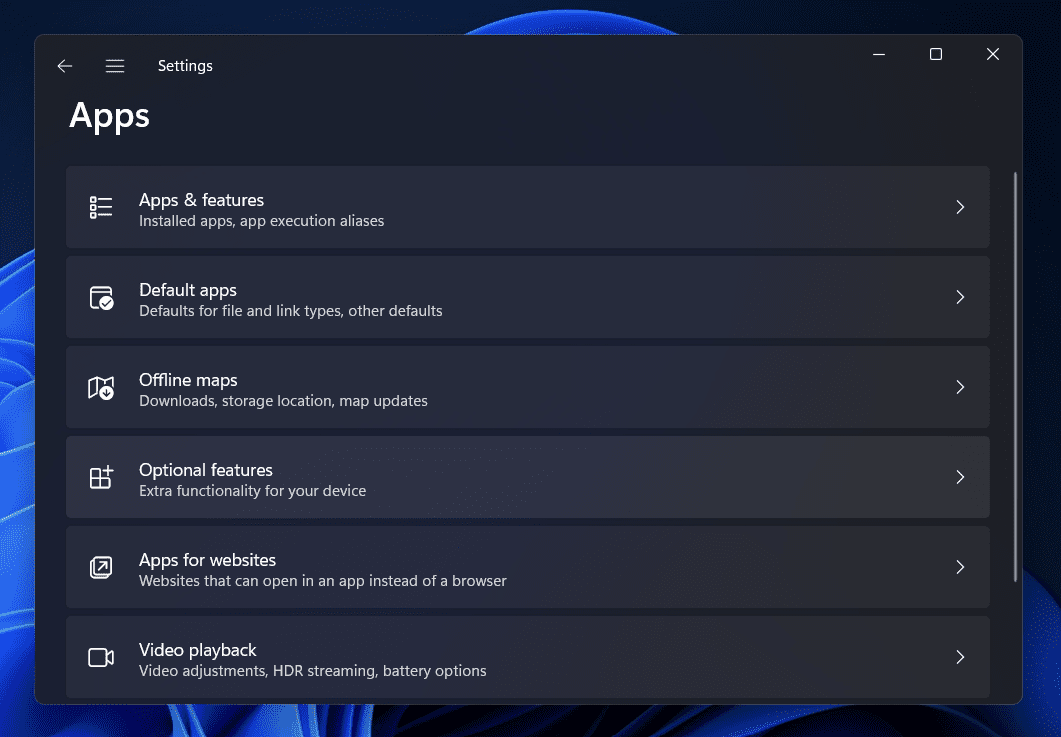 - Ici, cliquez surApplications et fonctionnalitéssur la barre latérale gauche.