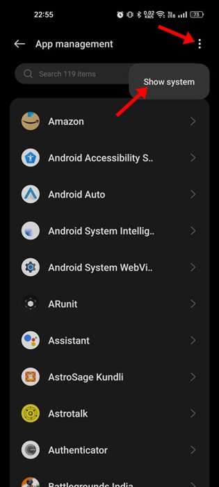 3. Appuyez sur les trois points en haut à droite et sélectionnezSystème de spectacle.