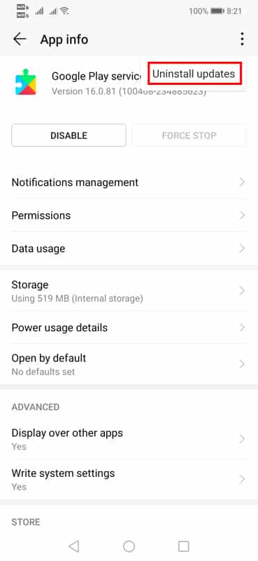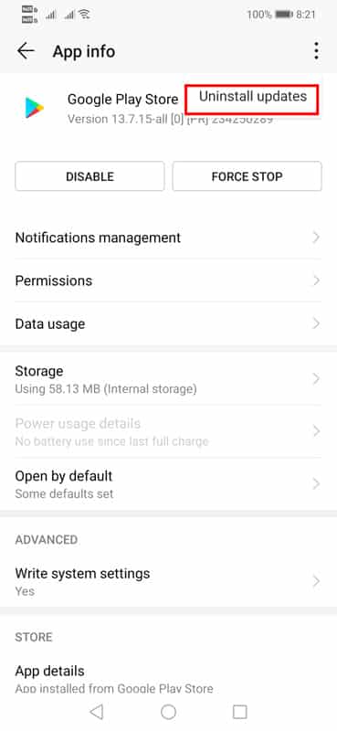 Si la méthode susmentionnée ne résout pas le message d'erreur, vous devez désinstaller les mises à jour du Play Store.