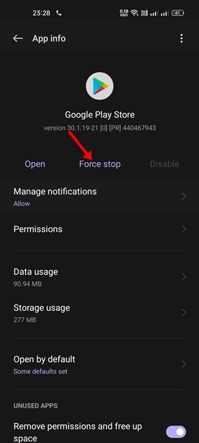 L'erreur «Votre appareil n'est pas compatible avec cette version» peut également résulter d'un bug de Google Play Store ou d'un problème. Vous pouvez éliminer ces bogues ou pépins en étouffant l'application sur votre Android.
