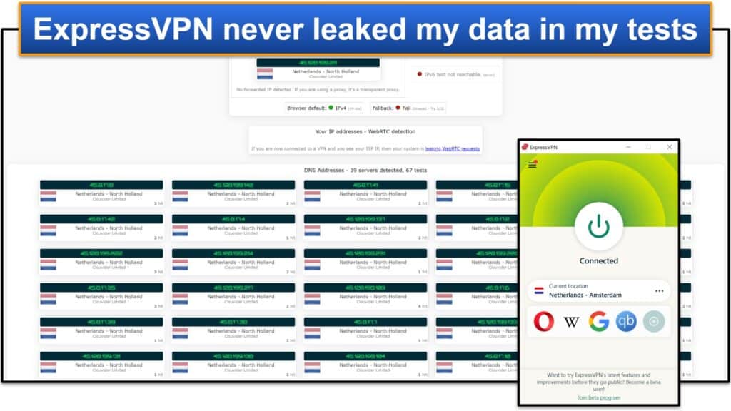 En plus de la protection des fuites DNS, vous obtenez également la protection des fuites IPv6 et WebBrTC.Je suis heureux de voir cela, car tous les meilleurs VPN n'offrent pas une protection complète des fuites. En fait, j'ai effectué des tests de fuite lors des connexions à plus de 5 serveurs d'ExpressVPN, et je n'ai jamais connu de fuites.