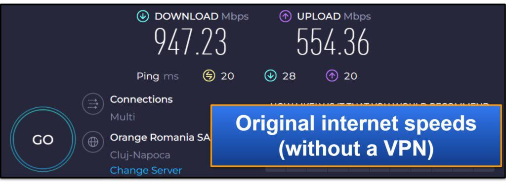 Il a commencé avec un test de vitesse sans être connecté au VPN.Voici une capture d'écran de ses vitesses de référence: