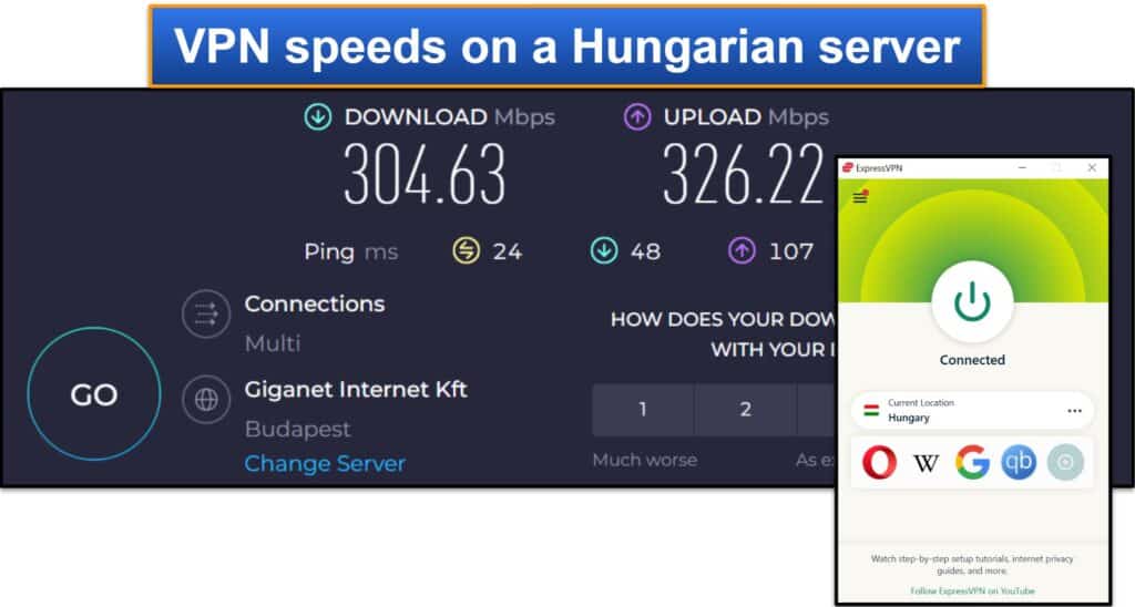 Ensuite, il a testé un serveur à proximité en Hongrie.Il m'a dit qu'il n'avait remarqué aucun ralentissement - c'était comme s'il n'utilisait pas du tout un VPN! Tous les sites auxquels il se connectait instantanément, les vidéos HD et 4K qu'il a regardées chargées instantanément aussi, et il n'a subi aucun décalage en jouant à des jeux en ligne.