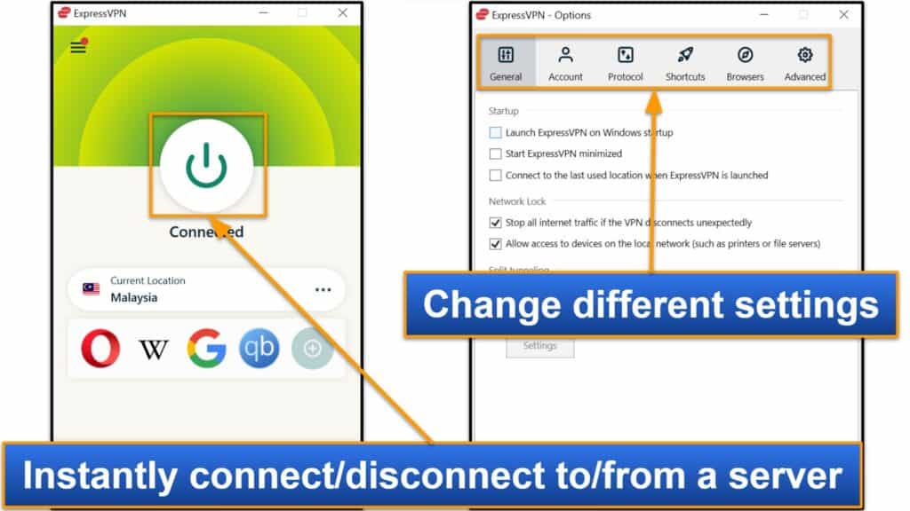 Je pense que ExpressVPN a le meilleurFenêtreetmacosapplications là-bas- Ils sont riches en fonctionnalités, fournissent des explications utiles pour tous les paramètres et sont très simples à utiliser. Il est également super facile d'installer ExpressVPN sur Windows et MacOS car il dispose d'assistants d'installation faciles à suivre.