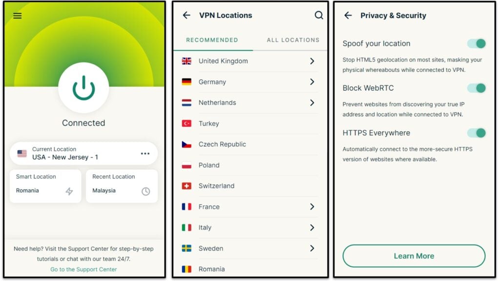 J'aime vraiment l'application Android d'ExpressVPN et l'application iOS- Ils sont tous deux très faciles à naviguer, et j'aime la façon dont il ne faut pas plus de 4 à 5 secondes pour trouver et se connecter à un serveur. De plus, il existe un outil de connexion rapide (appelée emplacement intelligent) qui vous connecte automatiquement au serveur le plus rapide pour votre emplacement, ce qui est utile si vous êtes pressé de sécuriser votre trafic.