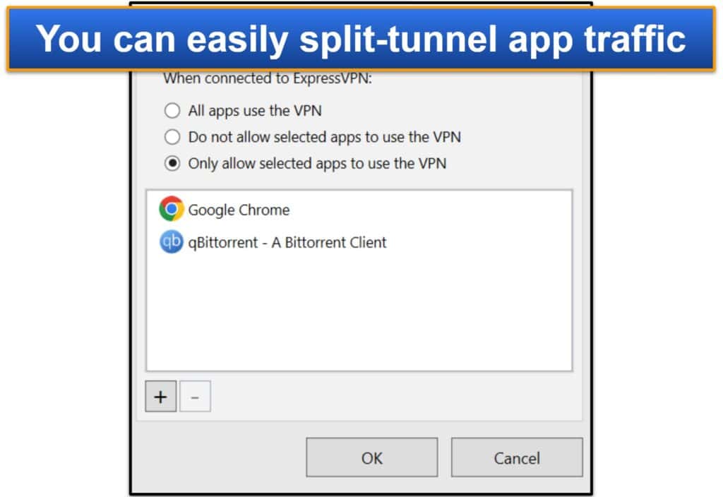La fonction de tunneling divisée d'ExpressVPN vous permet de choisir les applications que les applications utilisent le tunnel VPN et quelles applications ne le font pas.Par exemple, vous pouvez utiliser cet outil pour acheminer le trafic à partir d'un navigateur Web particulier via le VPN. La fonction de tunnels divisées du fournisseur est disponible sur Windows, MacOS (uniquement sur les versions plus anciennes que MacOS Big Sur, cependant) et Android.