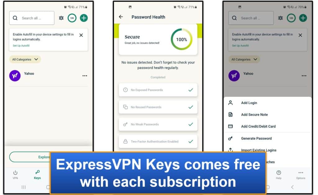 De plus, les clés ExpressVPN peuvent également auditer vos mots de passe.Il le fait via son outil de santé de mot de passe, qui vous avertit si vous utilisez des mots de passe exposés, réutilisés ou faibles.