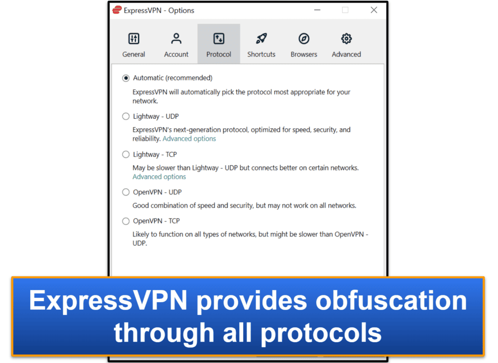 De plus, ExpressVPN est également livré avec une obscurité,Ce qui masque votre trafic VPN et vous permet de contourner les blocs DPI (méthodes d'analyse du trafic réseau qui bloquent le trafic VPN). J'aime particulièrement que l'obscurcissement soit disponible sur chaque emplacement du serveur VPN, car il facilite les utilisateurs des pays restrictifs de se connecter aux serveurs à proximité pour obtenir les meilleures vitesses.