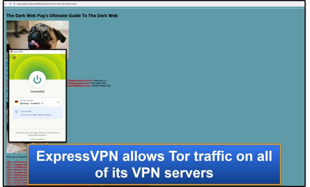 ExpressVPN a une très bonne prise en charge TOR, car elle permet un trafic Web sombre sur chaque serveur.Cela signifie que vous pouvez d'abord vous connecter à ExpressVPN avant d'utiliser le navigateur Tor pour accéder au Web Dark - de cette façon, si le réseau Tor souffre d'une fuite ou si vous utilisez accidentellement un serveur TOR qui est exécuté par des acteurs malveillants, votre véritable adresse IP ne sera pas exposée.