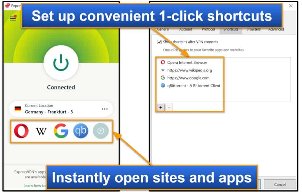 Les raccourcis sont une fonctionnalité qui vous permet de configurer des raccourcis en 1 clic pour des applications et des sites spécifiques.Ces raccourcis s'affichent ensuite sur l'écran de votre connexion après votre connexion à un serveur VPN - afin que vous puissiez les utiliser pour obtenir un accès instantané à vos applications et sites préférés. La fonction de raccourcis est disponible sur Windows, MacOS et Android.