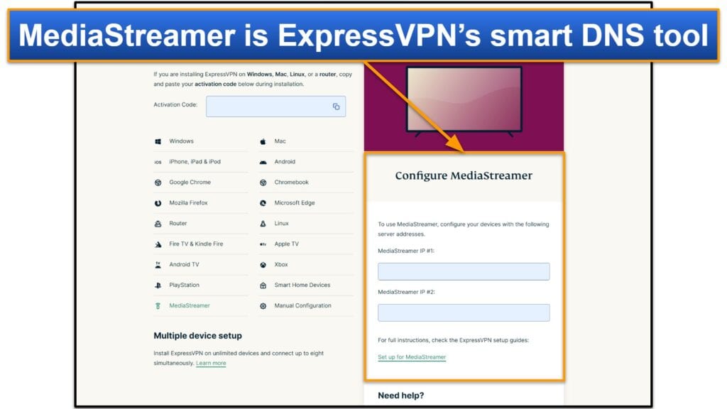 ExpressVPN offre un accès gratuit à un outil DNS intelligent qui s'appelle MediaStreamer.Un DNS intelligent est un outil de streaming qui vous permet d'accéder au contenu de streaming sur des appareils qui ne fonctionnent pas avec les applications VPN, comme certains modèles de télévision intelligents et les consoles de jeu.