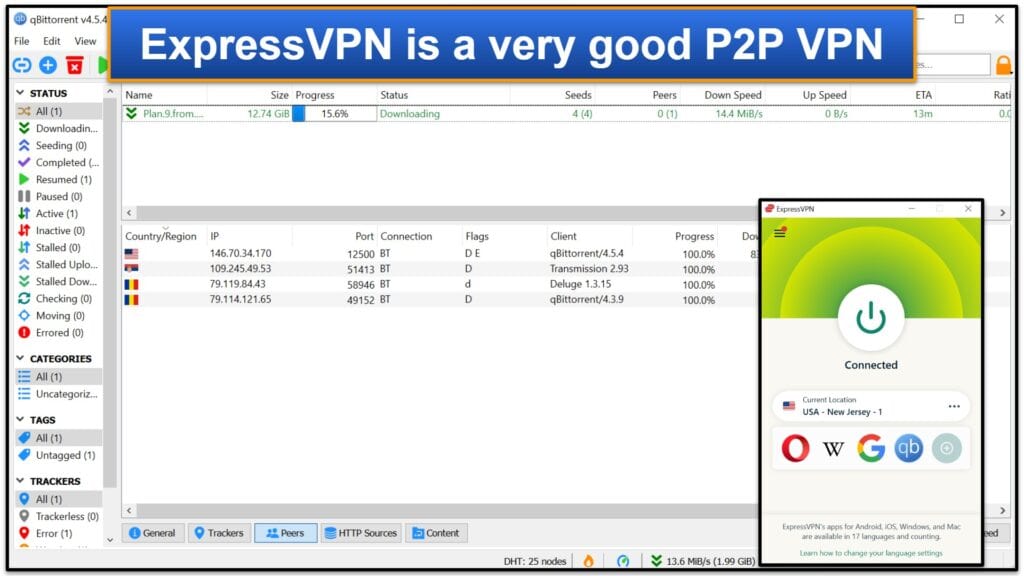 ExpressVPN est un excellent VPN P2PPuisqu'il permet le trafic P2P sur tous ses serveurs,qui sont situés dans plus de 100 pays. Il est donc très facile pour quiconque de torrent sur un serveur à proximité pour obtenir les vitesses de téléchargement les plus rapides.