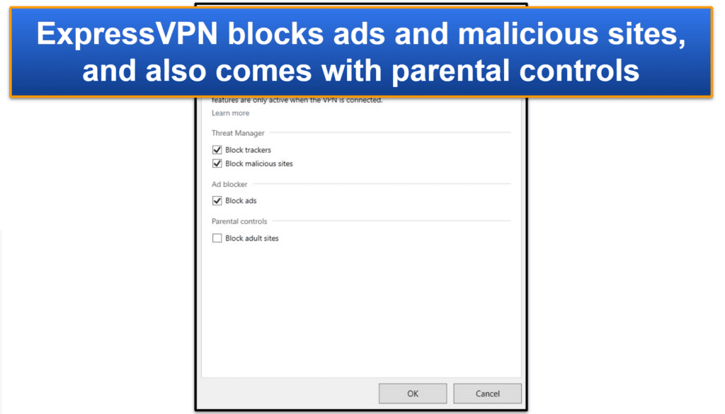 ExpressVPN donne accès au blocage de la publicité et du site malveillant et aux contrôles parentaux.Son outil de protection avancée est disponible sur ses applications Windows, MacOS, Linux, iOS et Android.