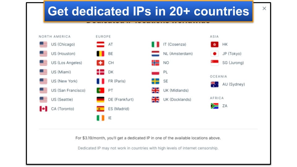 Pour un coût supplémentaire, vous pouvez obtenir une adresse IP dédiée.Il s'agit d'une adresse IP qui ne vous est attribuée que, vous ne le partagez donc pas avec d'autres utilisateurs de VPN. Les IP dédiés sont utiles pour éviter les recapts lorsque vous recherchez des choses sur les moteurs de recherche. Ils sont également bons pour accéder aux sites Web qui bloquent normalement les adresses IP VPN partagées, comme les sites bancaires.