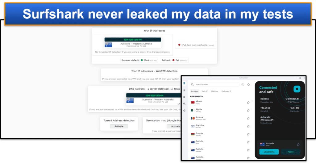Malheureusement, le surfshark manque IPv6 et la protection des fuites de WebBrTC,Quels autres meilleurs concurrents commeExpressvpnetNordvpnavoir. Cela dit, j'ai effectué des tests de fuite sur les serveurs dans plus de 10 pays, et je n'ai jamais connu de fuites.
