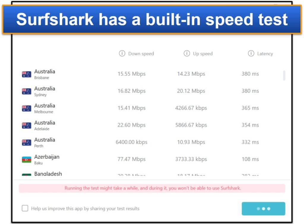 Surfshark donne accès à un test de vitesse intégré sur son application Windows.Cet outil vous aide à déterminer quels emplacements de serveur vous fourniraient les vitesses les plus rapides.