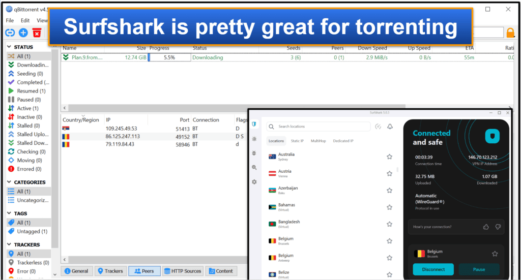 Chaque fois que j'utilise le surfshark pour le torrent, j'ai généralement de très bonnes vitesses de téléchargement.Pour cette revue, j'ai torpenté un fichier de 12,74 Go en environ 55 minutes, ce qui est décent. De plus, si vous souhaitez accélérer vos téléchargements, vous pouvez toujours utiliser la fonction de tunneling divisée du fournisseur.