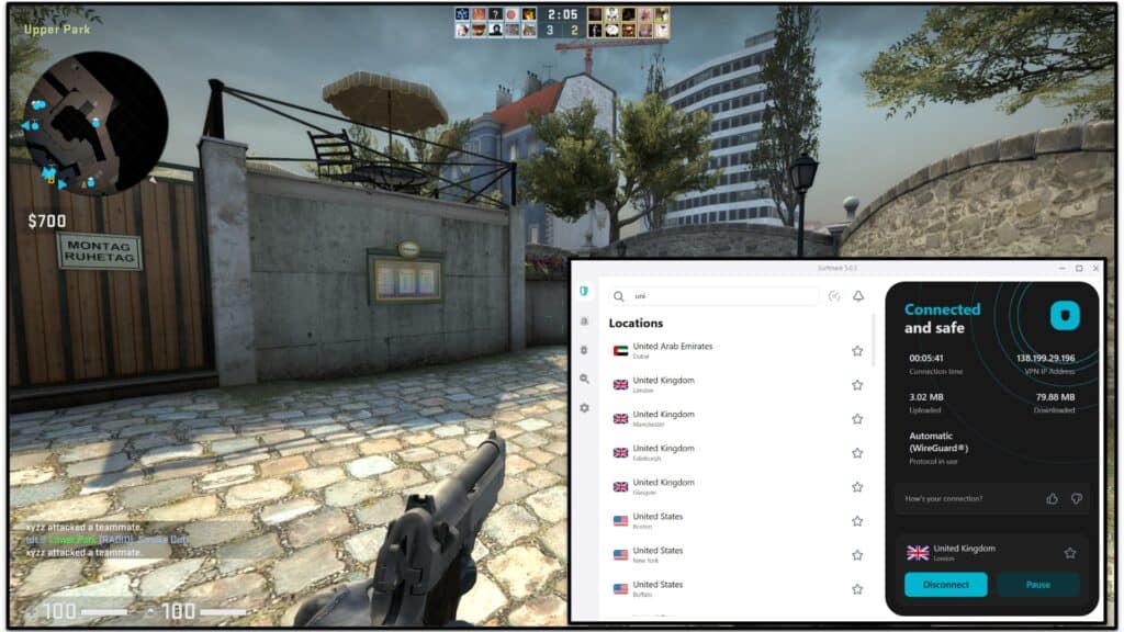 Surfshark offre une expérience de jeu très fluide et stable.Je l'ai utilisé pour jouer quelques tours deCounter-Strike: Offensive mondialePour cette revue, et j'ai eu une très bonne expérience - j'ai maintenu un ping moyen (133–141 ms), je me suis connecté à des matchs très rapidement et je n'ai jamais connu de décalage.