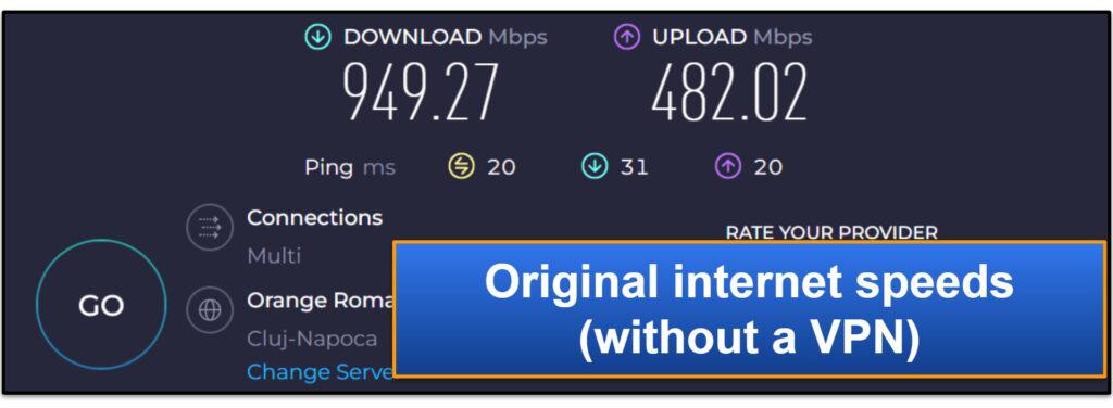 Tout d'abord, il a effectué un test de vitesse sans être connecté au VPN.Ce sont ses résultats:
