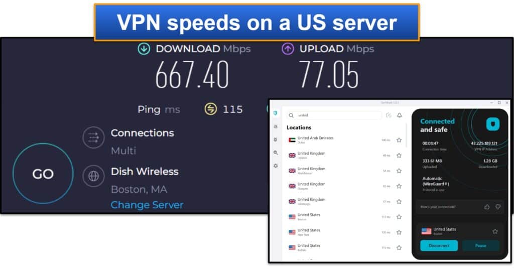 Ensuite, il a testé un serveur lointain aux États-Unis.À sa grande surprise, il a à peine connu des ralentissements! Tous les sites auxquels il a accédé a continué à charger instantanément, tout comme les vidéos HD et 4K. De plus, il a pu jouer à des jeux en ligne sans éprouver de décalage.