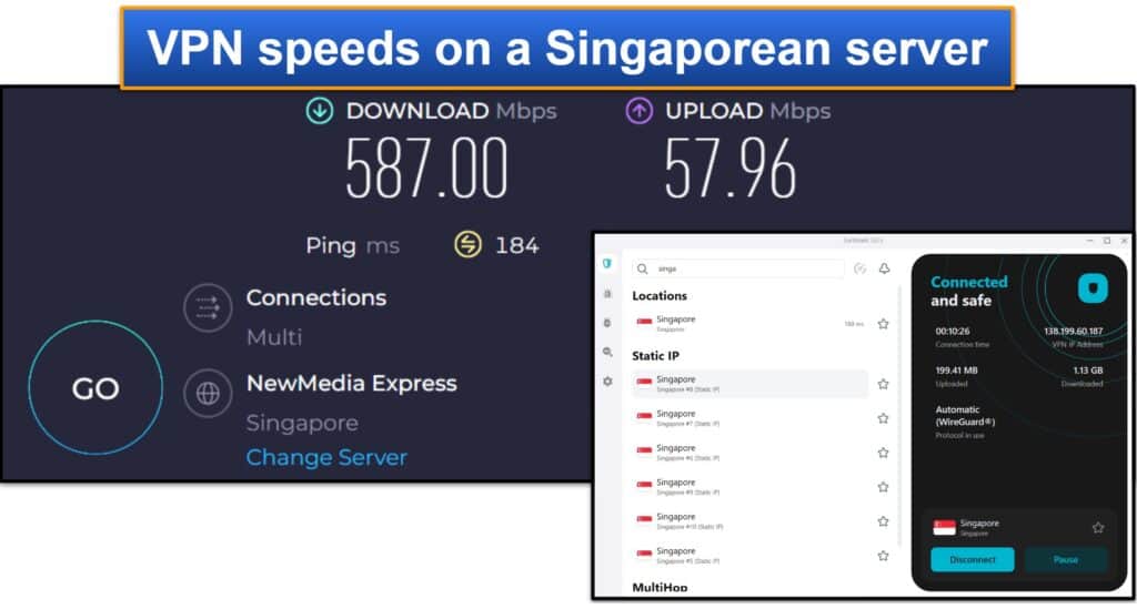 Enfin, mon ami a testé un serveur lointain à Singapour.Il a connu des ralentissements, mais ils étaient très mineurs - les sites auxquels il a accédé chargé en 2 secondes, les vidéos HD chargées instantanément et ne se sont pas tamponnées, et des vidéos 4K aussi seulement 2 secondes pour se charger et il n'y a eu que tampon mineur au début.