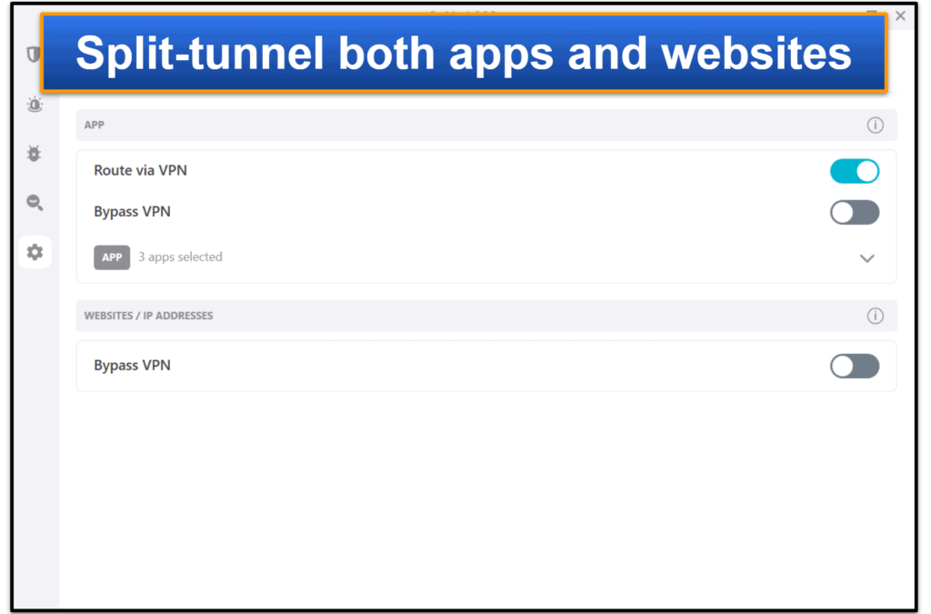 Bypasser est l'outil de tunnels divisés de Surfshark,Ce qui vous permet de choisir les applications qui utilisent ou n'utilisent pas le VPN. De plus, vous pouvez également choisir les sites Web contournant le tunnel VPN. Par exemple, vous pouvez utiliser la fonction de tunneling divisé pour acheminer uniquement le trafic Netflix via le VPN pour obtenir des vitesses de streaming plus rapides.