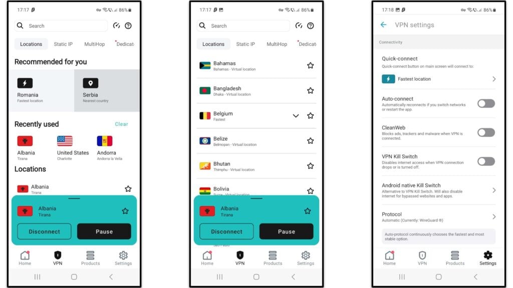 Et l'application est également vraiment sécurisée,car il a un interrupteur de mise à mort et les protocoles Wireguard et OpenVPN. Vous avez également accès à l'outil CleanWeb et aux serveurs MultiHop dynamiques.