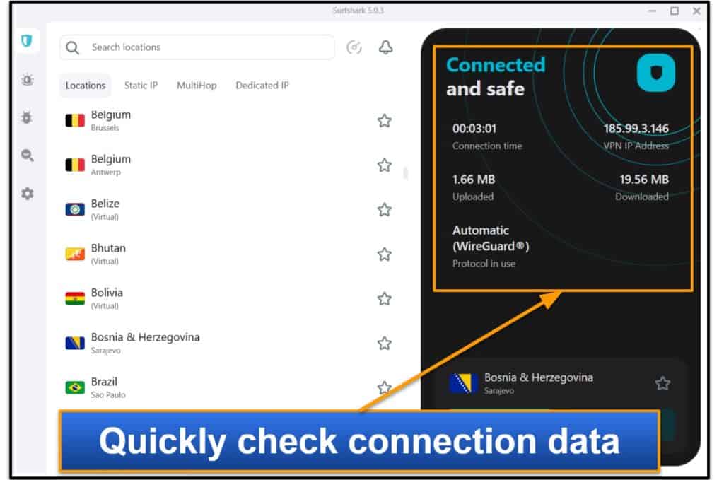 Le fournisseur utilise également des serveurs virtuels.Ce sont des serveurs qui vous fournissent une adresse IP du pays auquel vous vous connectez, mais ils sont physiquement situés dans un autre pays. J'aime vraiment la façon dont Surfshark est transparent quant à son utilisation des emplacements virtuels, car il les marque dans ses applications. De plus, ses emplacements virtuels fonctionnent très bien - j'en ai testé 10+, et ils m'ont toujours fourni la bonne adresse IP.