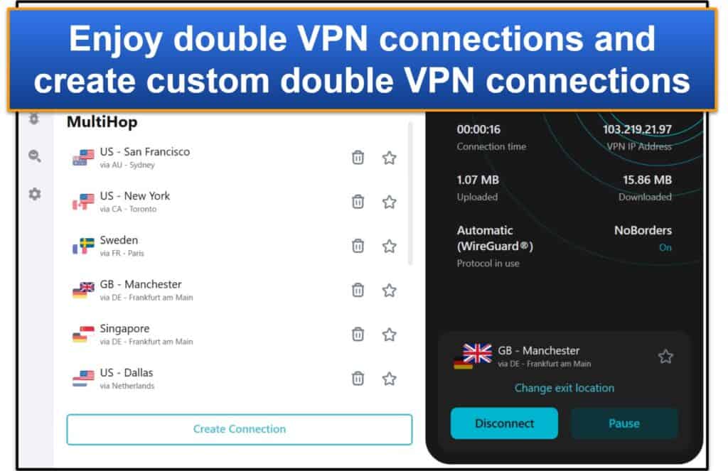 Une double connexion VPN provoque généralement des ralentissements notables, mais ce n'était pas le cas avec ce fournisseur.J'ai testé plus de 10 connexions VPN double et mes vitesses n'ont chuté que d'environ 15% par rapport au moment où j'ai utilisé une connexion VPN normale.