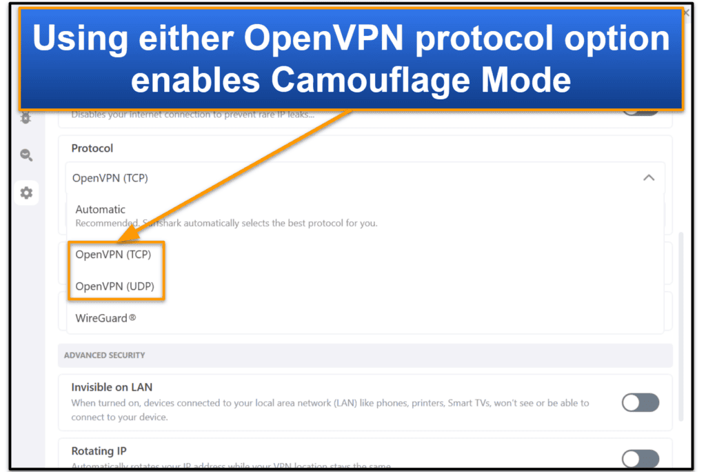 Le mode de camouflage est la fonction d'obscurcissement de Surfshark,Ce qui masque votre trafic VPN et le fait ressembler à un trafic Internet normal. Le mode de camouflage est automatiquement activé sur tous les serveurs du fournisseur lorsque vous utilisez le protocole OpenVPN.