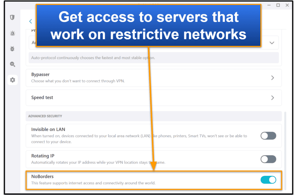 Noborders vous donne accès aux serveurs qui fonctionnent sur des réseaux restrictifs.Par exemple, si vous êtes au travail ou à l'école et que votre réseau a un pare-feu restrictif, les Noborders vous permettraient d'utiliser des serveurs qui peuvent contourner ces restrictions. Cette fonctionnalité est disponible sur Windows, MacOS, Android et iOS.