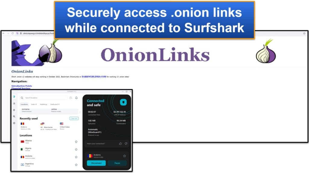 Surfshark permet le trafic TOR sur tous ses serveurs,Ce qui signifie que vous pouvez d'abord vous connecter à l'un des serveurs du fournisseur pour sécuriser vos données avant d'accéder au Web Dark.