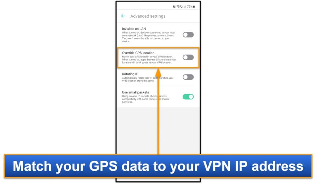 Cette fonctionnalité vous permet de masquer vos données GPS, afin qu'elle corresponde à votre emplacement d'adresse IP VPN.Cet outil est vraiment bon pour le streaming, mais gardez à l'esprit qu'il n'est disponible que sur Android.