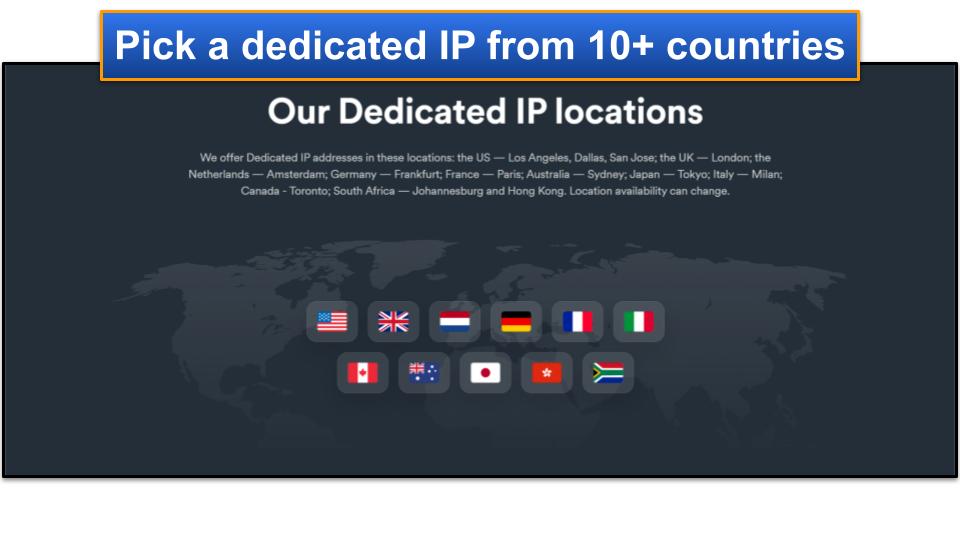 Enfin, vous avez également accès à des IP dédiés dans plus de 10 pays,comme les États-Unis, le Royaume-Uni, les Pays-Bas et l'Allemagne. Vous devez payer un petit prix abordable pour utiliser une adresse IP dédiée.